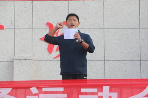 随后,李跃校长为本次运动会致开幕词。他首先对运动会的顺利召开表示热烈祝贺,向精心筹备运动会的老师们和积极参与的同学们表示衷心感谢。李校长提到,体育是力量的角逐,是智慧的较量,更是精神的展现,希望全体同学能在本次运动会中享受运动乐趣,锻炼强健体魄,培养坚韧意志,同时遵守比赛规则,展现五一学子的良好风貌。最后,他预祝本次运动会取得圆满成功。